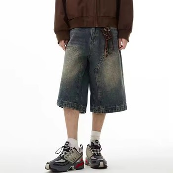 ZY, pantalones cortos de mezclilla desgastados con lavado ácido para hombre, pantalones cortos holgados de algodón de peso pesado, ropa de calle de cintura media, pantalones vaqueros lavados Vintage de talla grande